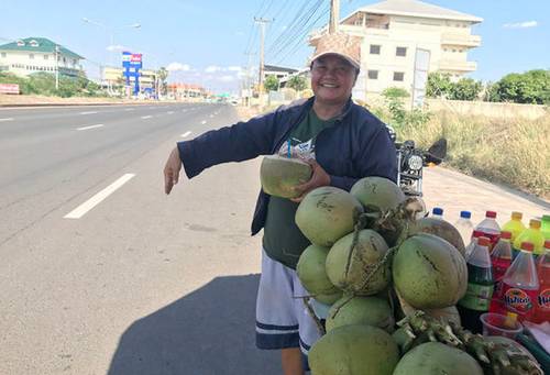 最近由于天气炎热,泰国素林府直辖县Surin-Sikhoraphum路边卖椰子的大妈(49岁)生意好到爆,大妈透露以前在工厂上班很艰辛,后来转行来路边摆摊卖椰子,以每个8铢的价格从村里收购椰子,再以每个20-25铢的价格出售(椰子水15铢/袋)。
