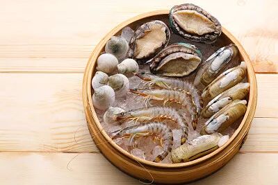 鲜活的基围虾、螃蟹、鱿魚和多款海魚