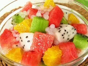 原 料: 西米、牛奶(或者椰奶)、水果(草莓、西瓜、苹果或者你喜欢的水果)。