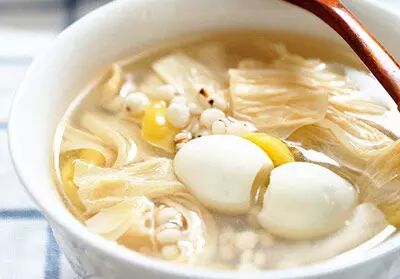 材料:干腐竹75克、白果75克、薏米38克、鸡蛋2只、冰糖150克、水8杯或适量