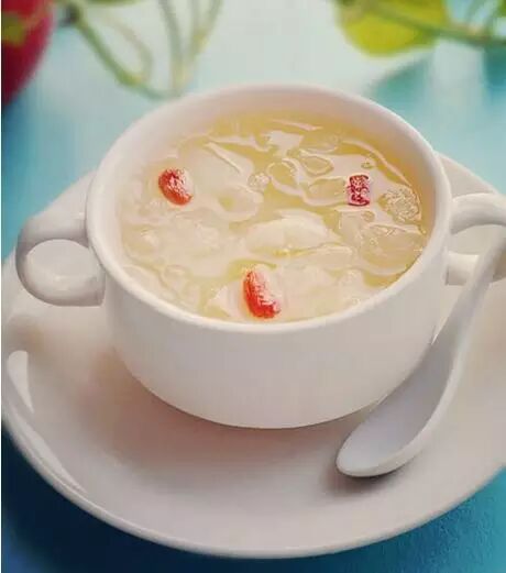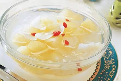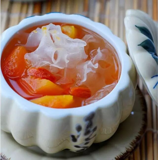 养阴润肺,滋润皮肤,防止皱纹过早出现,保持皮肤幼嫩,延缓衰老。可治疗燥热咳嗽、干咳无痰。用料:木瓜半只(约200克),银耳三大朵(约20克),冰糖适量(约50克)。将银耳用温水浸透泡发,洗净撕成小朵,木瓜削皮去籽,切成小块;银耳、木瓜和冰糖一起放入锅里,加适量水煮开,然后转小火炖煮30分钟至1个小时,即可食用。