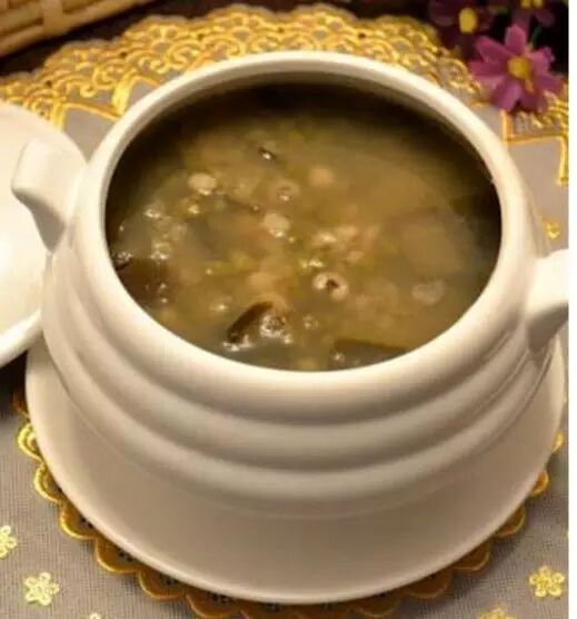 白果和薏米都有清热去湿的功效,天气燥热或胸中烦闷时,煲些白果薏米糖水吃,能清除燥热,使身体舒畅。用料:干腐竹75克、白果75克、薏米38克、鸡蛋2只、冰糖150克、水8杯或适量。腐竹浸软,白果去壳,然后用热水浸片刻,撕去衣,去心;煲滚水,将白果、薏米放入煲半小时,然后加入腐竹、冰糖,煲至冰糖溶化,将熟鸡蛋去壳并放入糖水中, 煮至薏米刚熟即成。