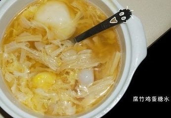 材料:干腐竹10克,鸡蛋2只、冰糖适量、姜一小片