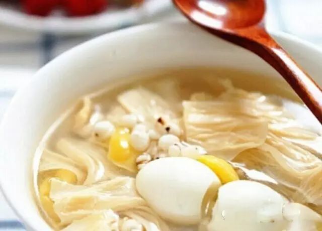 干腐竹75克、白果75克、薏米38克、鸡蛋2只、冰糖150克、水8杯或适量