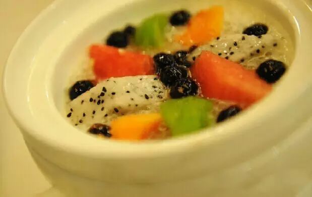 5、最后将你喜欢的水果切丁,放进冰冻的西米露里即可。