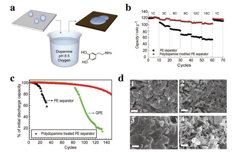 图1. (a)多巴胺在pH8.5的水溶液中聚合,得到聚多巴胺改性的PE表面变成亲水性;(b)聚多巴胺表面处理前后的PE隔膜电池的倍率性能;(c)具有不同隔膜电池的循环性能;(d)使用PE分离器从电池拆卸的在第一个循环和20个循环后有和没有聚多巴胺处理的锂-金属电极的SEM图。