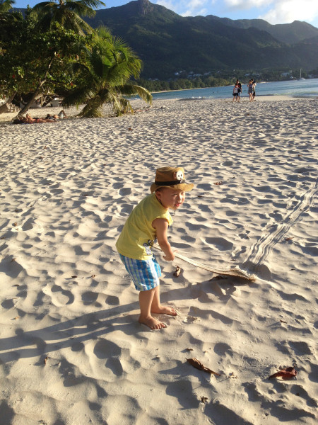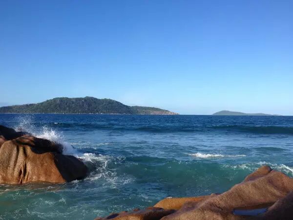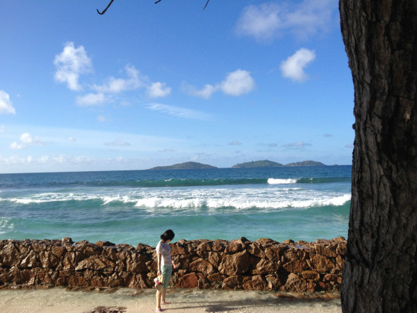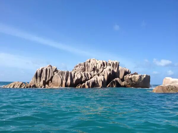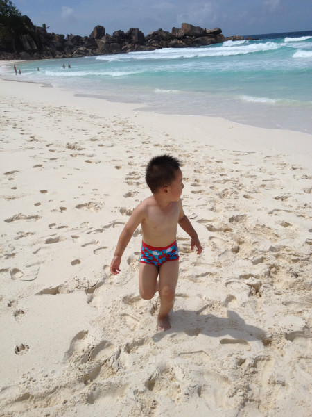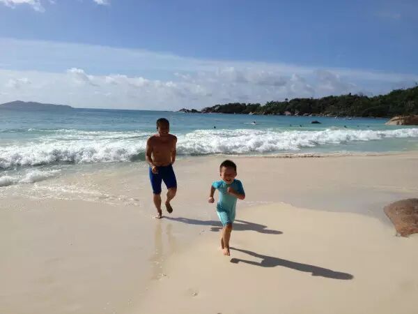 这里是很适合浮潜的地方,可是我们为了陪儿子站在脚能触底的地方,让他不那么害怕,却错误地选择了花岗岩旁边。脚下是尖锐的小石头,身后是湿滑的大石头,都不能帮我们平衡身体。浪又大,一个大浪直接把我拍在花岗岩石上,尾椎骨撞的又疼又肿,半个月才好。儿子见状,大哭大叫,语无伦次,扑在爸爸身上再也不肯下来。等我们回了船上,才发现老公的膝盖划了长长的口子。儿子吓的此后几天只敢远远站在沙滩上,再也不敢下水。