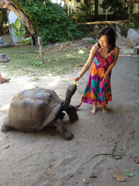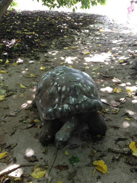 第一站,Cousin Island,快艇20分钟就到了。这个岛是海鸟和象龟的家。它们完全不怕人,随便参观,可见这里的人们对它们是多么爱护有加。图中的大象龟260岁啰。