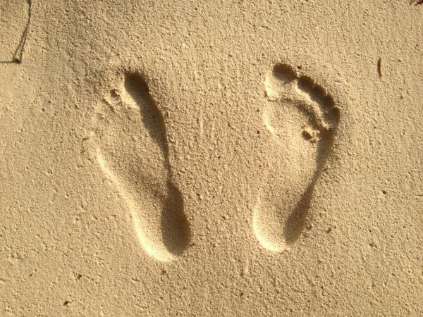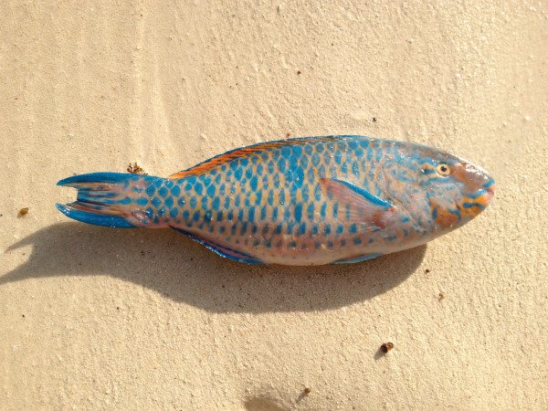 4点过,回到住处,安顿儿子睡个午觉,我和老公拿着请房东帮我们买的鹦鹉鱼去屋后的海边打整。这条一尺来长好看的鱼100卢比。老公忙着干活,我忙着拍下我的脚印。