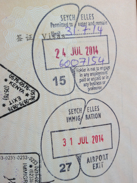 塞舌尔是免签国家,入境手续十分简单,向工作人员出示了护照、黄本、在飞机上就填好的入境表以及机票(用手机拍下机票一举是多么明智啊)之后,一枚极有特色的入境章盖在了护照上,允许停留的时间与机票的往返时间一致。