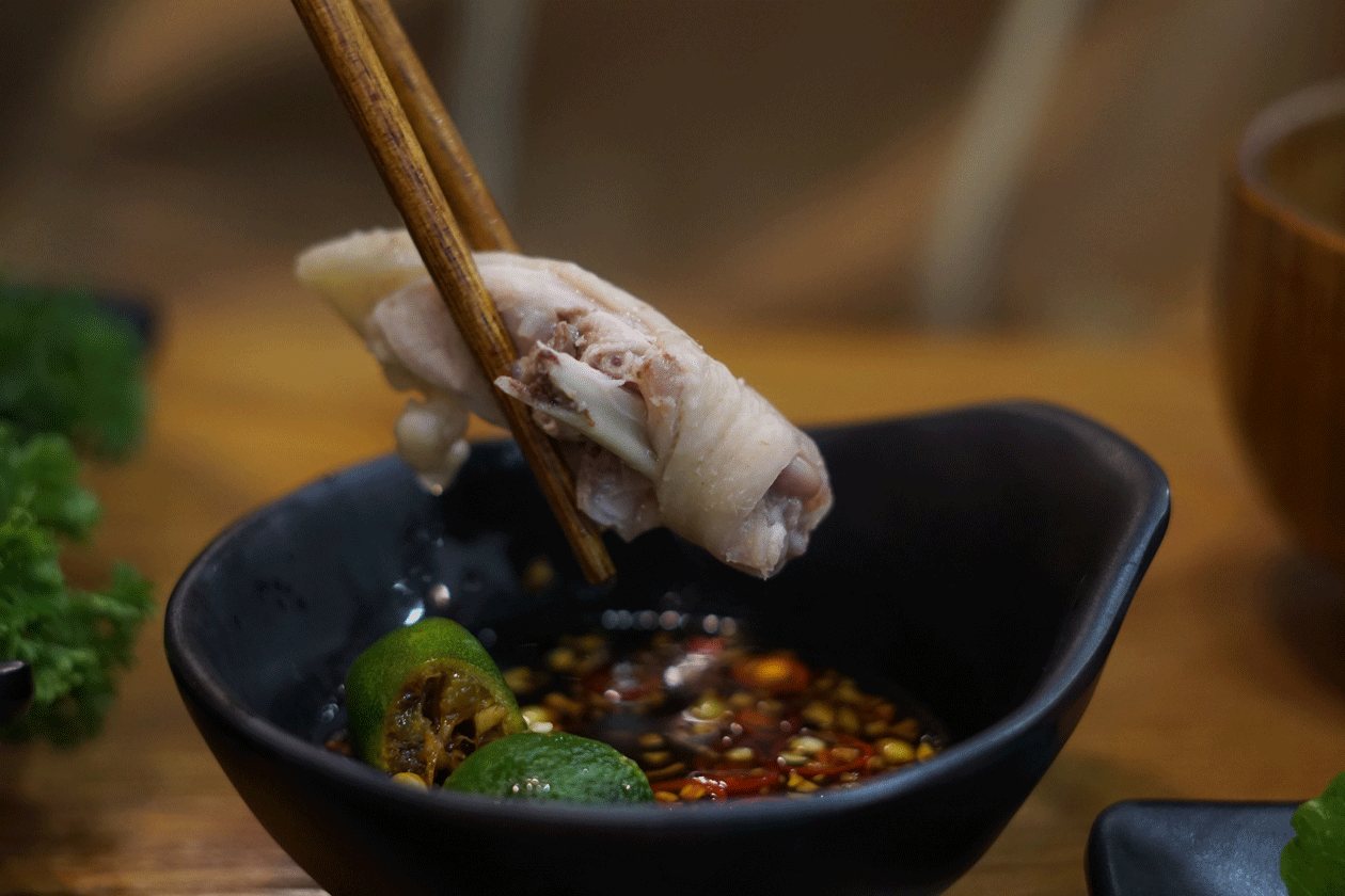 喝完汤润完喉,准备好调料,那就可以吃鸡肉了!挑一块的部位的鸡肉,一定要带皮吃,鸡肉嫩,鸡皮弹,文昌鸡的口感不是普通肉鸡可以相比的。