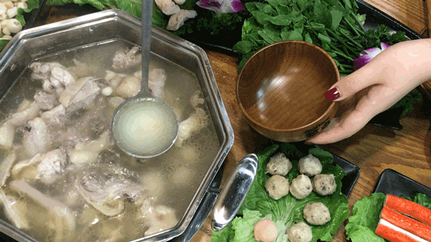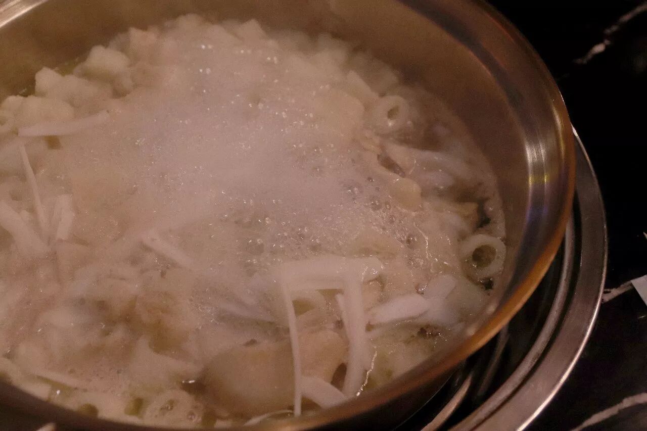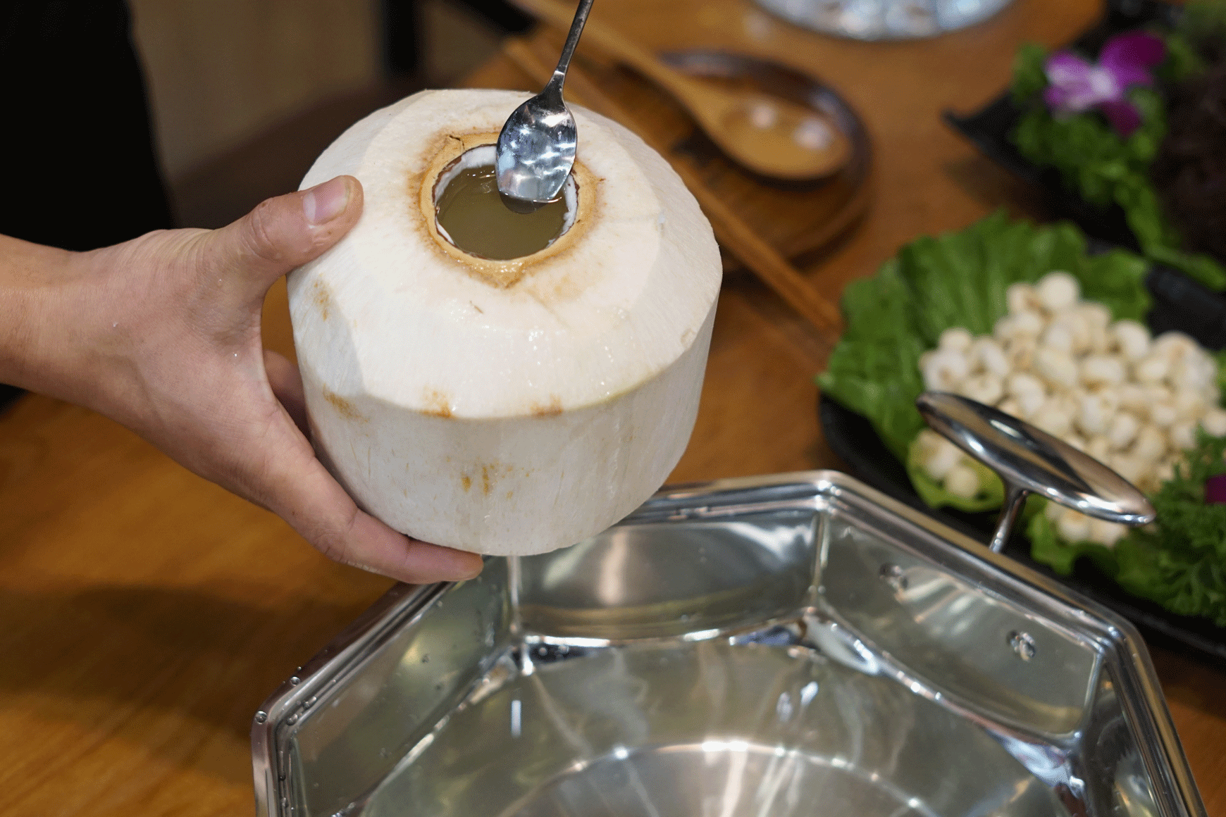 锅底有清淡的椰子香味,但不浓郁,不喜欢吃椰子的也可以很容易地接受这个味道。添加锅底可以加钱加椰子,普通的是加清水。