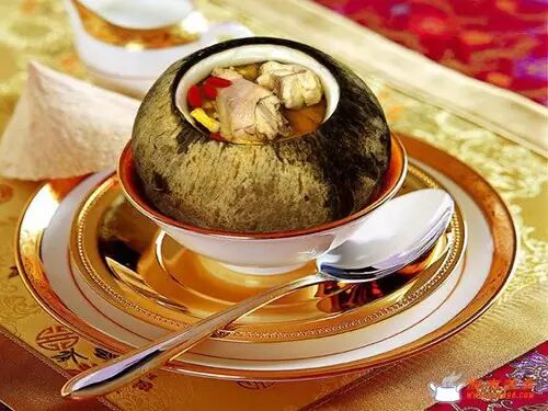 椰子:用原只椰子作为炖汤的容器,没有用一滴水,用的是椰子里面的清椰汁来作为汤的水分,清、甜、香、润。而用原只椰子来当炖盅,使里面椰肉的清香通过炖过程迅速融入鸡汤里,整个汤都充满了椰子的清新香味,喝的时候真是觉得从里润到外啊。而选椰子也大有讲究,老椰子炖起来更加香,嫩椰子则比较清甜。