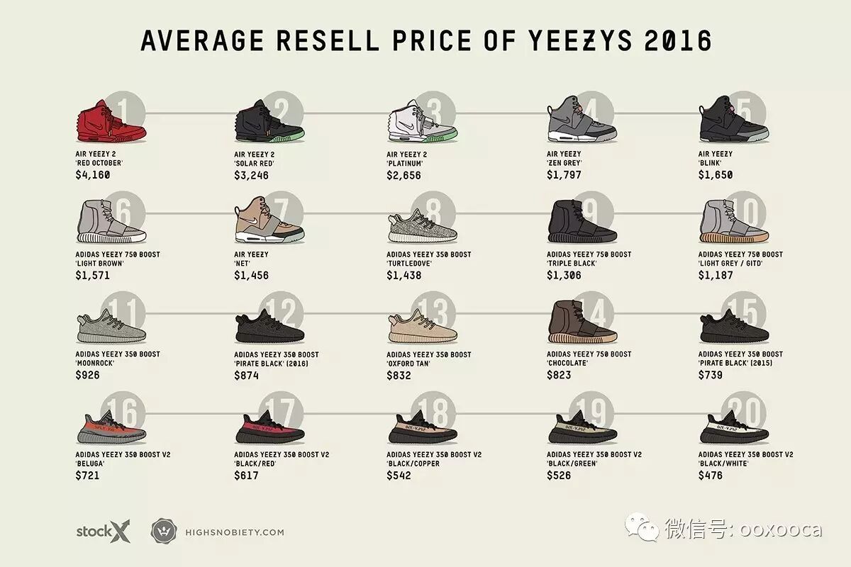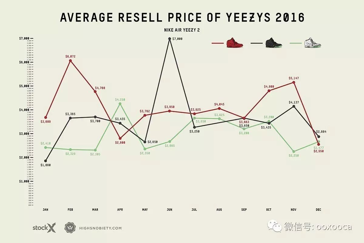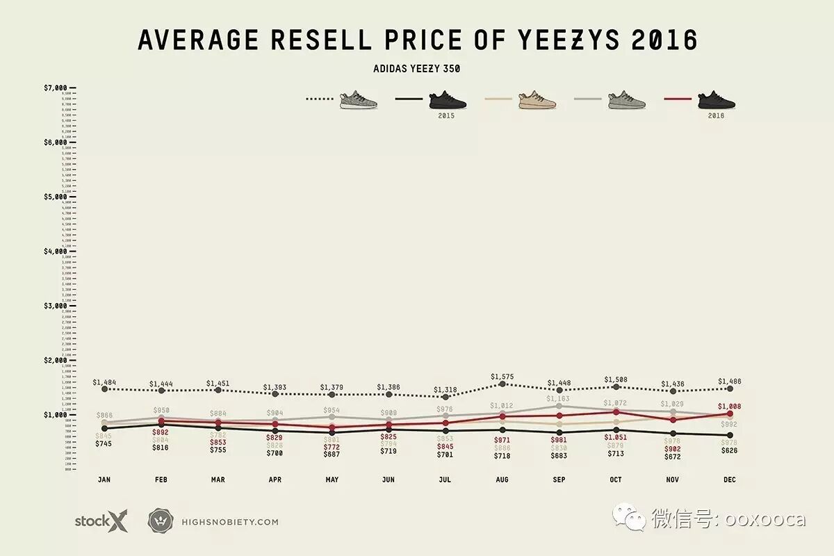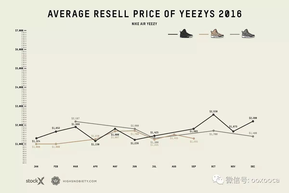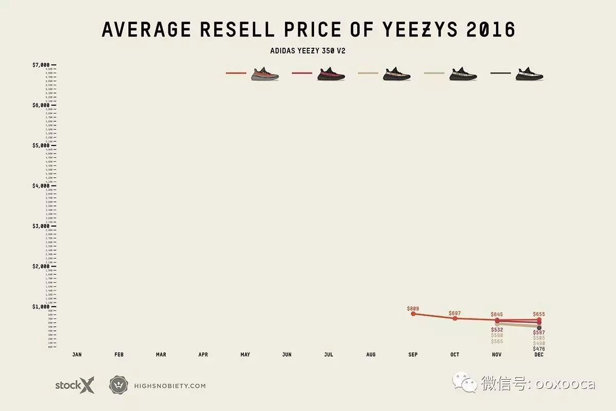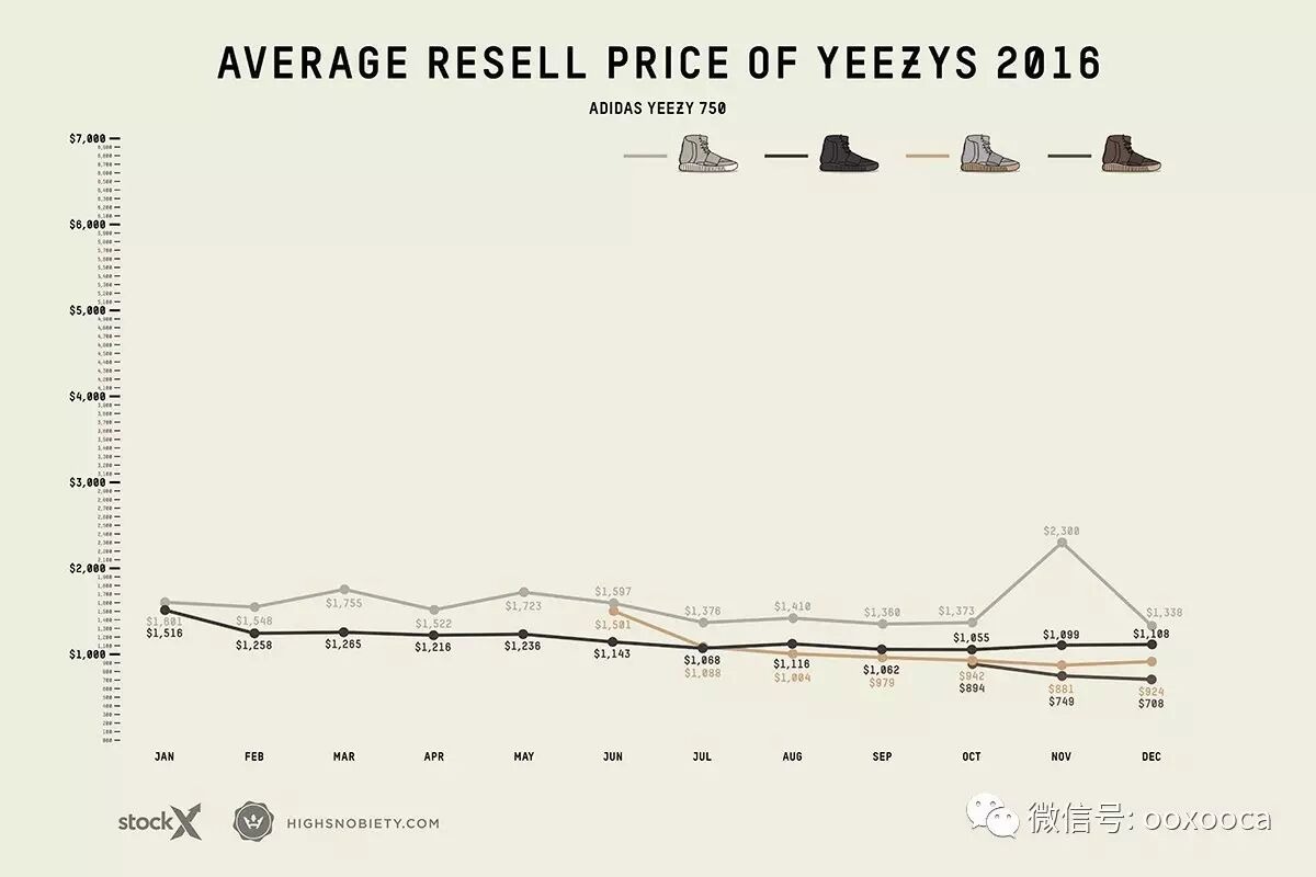 回看2016年,侃爷的一些设计是最抢手的一些鞋款。下面的每一张图包括了2016年每个月椰子系列的平均转卖价格,无论是想要转卖还是想要入手的球鞋爱好者们都可以看看这些数据来帮助自己做决定。