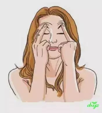 整体面部肌肉放松,将双手食指放于外眼角、中指放置眉心,轻柔缓慢向上推动。目光向下看、闭紧双眼,活动眼部周围肌肉。