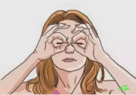 食指放置外眼角、中指放置内眼角,双手手指固定位置后轻轻按压。闭眼后目光向上看,面部放松。
