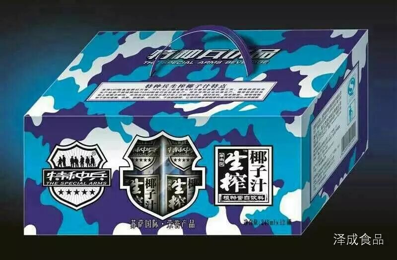 特种兵-中国椰子汁行业领先品牌!绿色纯天然,生榨就是新鲜! 2023-04-19 23:50:29 品牌:特种兵种类:饮品规格:245ml/罐,12罐/箱(礼盒装)价格:批发价38元/箱,零售价:48元/箱特种兵-中国椰子汁行业领先品牌!口感爽滑,喝一口根本停不下来!绿色纯天然、无添加剂、色素、甜蜜素,精选优质天然椰子,取上等柚子肉,首创先进的生榨水果打浆工艺!