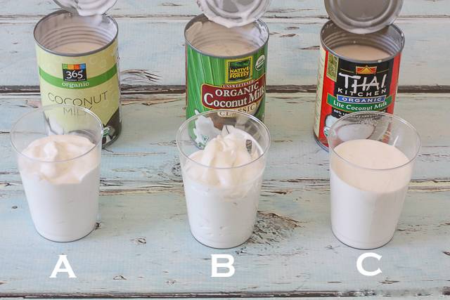 跟淡奶油一样,椰奶油是可以打发的!前提是脂肪含量必须够高——否则,对着右边的那听“lite”版椰浆,就像要试图打发牛奶一样无能为力。