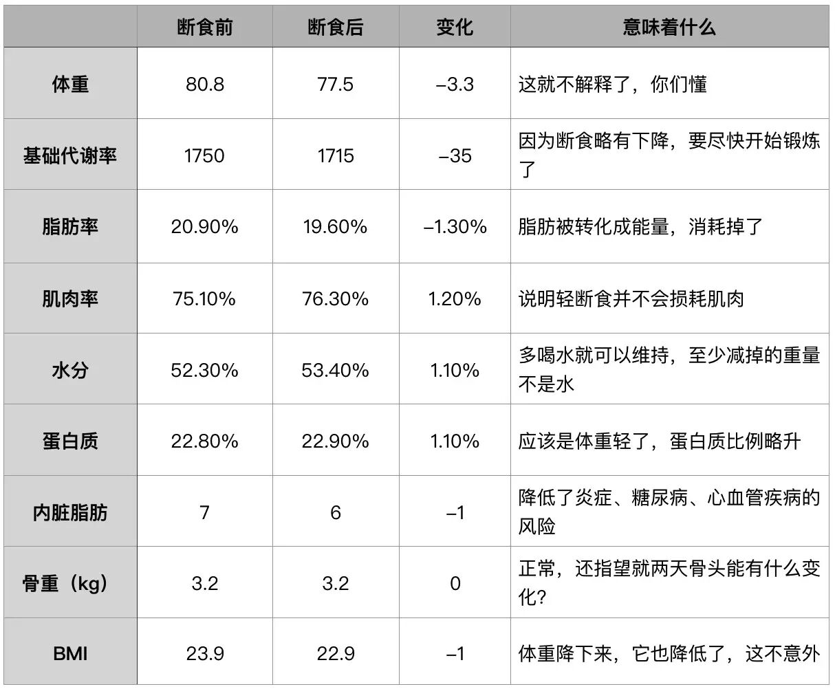 首先,身体的含水量,蛋白质含量,肌肉比率都没有下降,这些都是构成一个健康的身体最重要的几个指标。如果光喝水不吃东西,身体因为缺乏能量,将身体的肌肉分解成能量,结果肌肉率下降,身体的整体代谢就更低了,回头一吃准胖回来。
