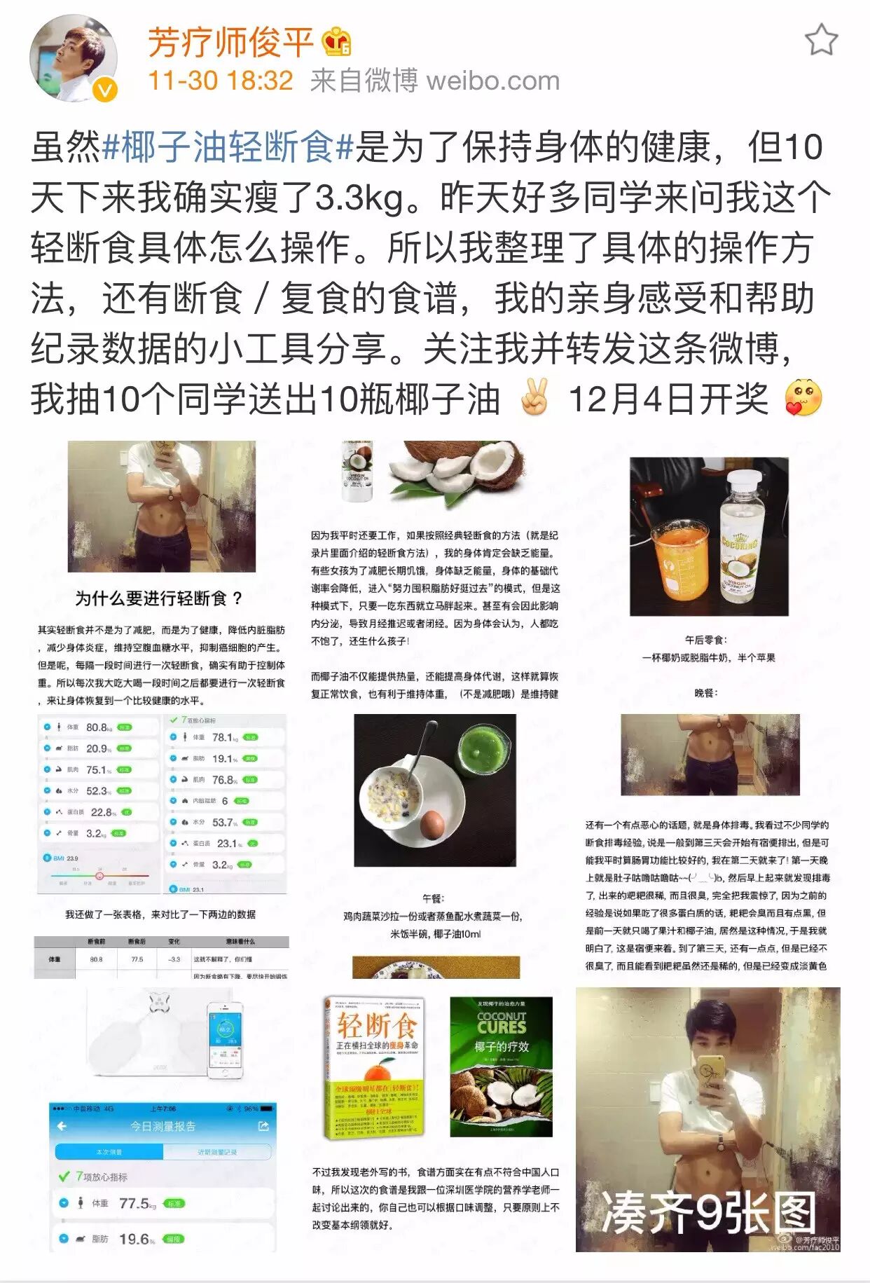 连续大吃大喝了一个星期,不能忍了!准备开始进行新一轮的椰子油轻断食。一个星期的时间快速掉掉肉。好多同学都来问我椰子油轻断食到底应该怎么操作呢?轻断食和完全断食有什么区别呢?对身体有没有伤害?轻断食到底是为了干什么呢?好多问题。但是因为这次椰子油轻断食才刚开始,所以还没有连续的数据,所以我就把上次进行轻断食的时候的数据和过程重新整理了一下给大家参考。