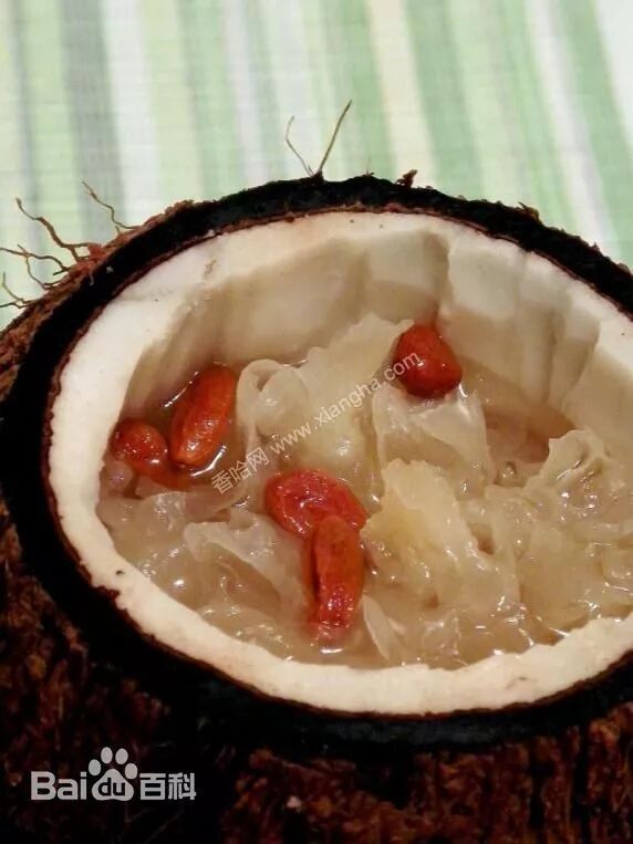 白果15粒、百合10g、无花果5枚、雪耳1朵(中等大小)、蜜枣2粒、椰浆1罐、小椰子1个(4人份)。