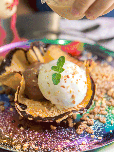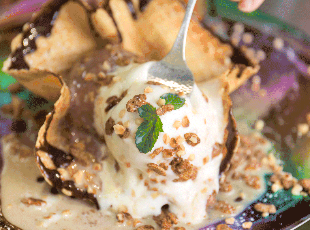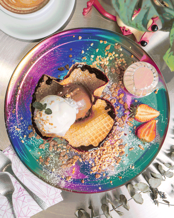 新鲜烘烤出来的华夫饼,放上两颗Gelato球,再撒上些麦片碎,看着无异,其实还有小心机~