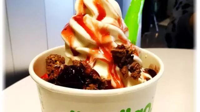 酸奶冰淇淋打底,然后加上各种配料。酸奶的口感很浓郁,微酸。