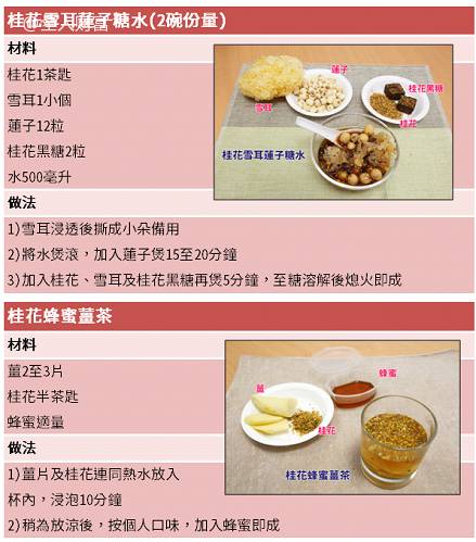 建议可家自制健康甜品,例如用桂花、雪耳、莲子制作桂花雪耳莲子糖水,当中不含脂肪,由于添加了桂花的清香,可减少用糖,雪耳亦含纤维及蛋白质,有助饱肚。冬天爱热饮的人也可炮制桂花蜂蜜姜茶,桂花可提升姜茶的香味,姜茶也有驱寒功效,用热水泡好姜片及桂花后,可随个人口味加入蜂蜜,有助控制糖份用量,为冬天窝心热饮。