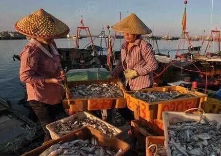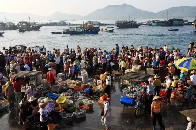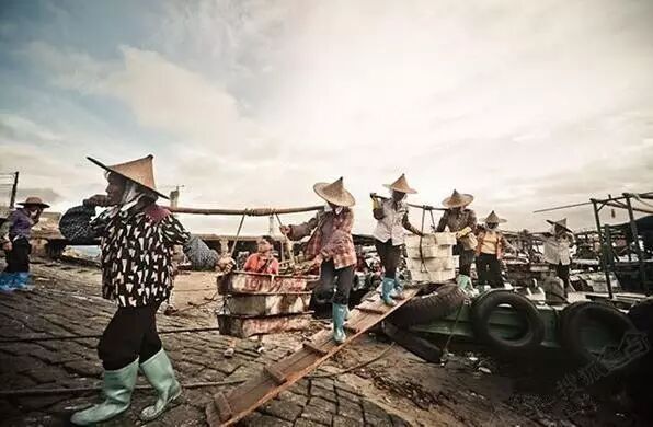 这里可以说是女人的天下,数百上千名“渔婆”集聚在儋州市白马井镇南司港码头,翘首以待渔船归来,当渔船满仓归来时,“渔婆”们蜂拥抢购鲜鱼,她们头戴或尖顶、或圆顶的竹编斗笠,脚穿各色水靴,肩挑扁担与箩筐,集聚在码头……