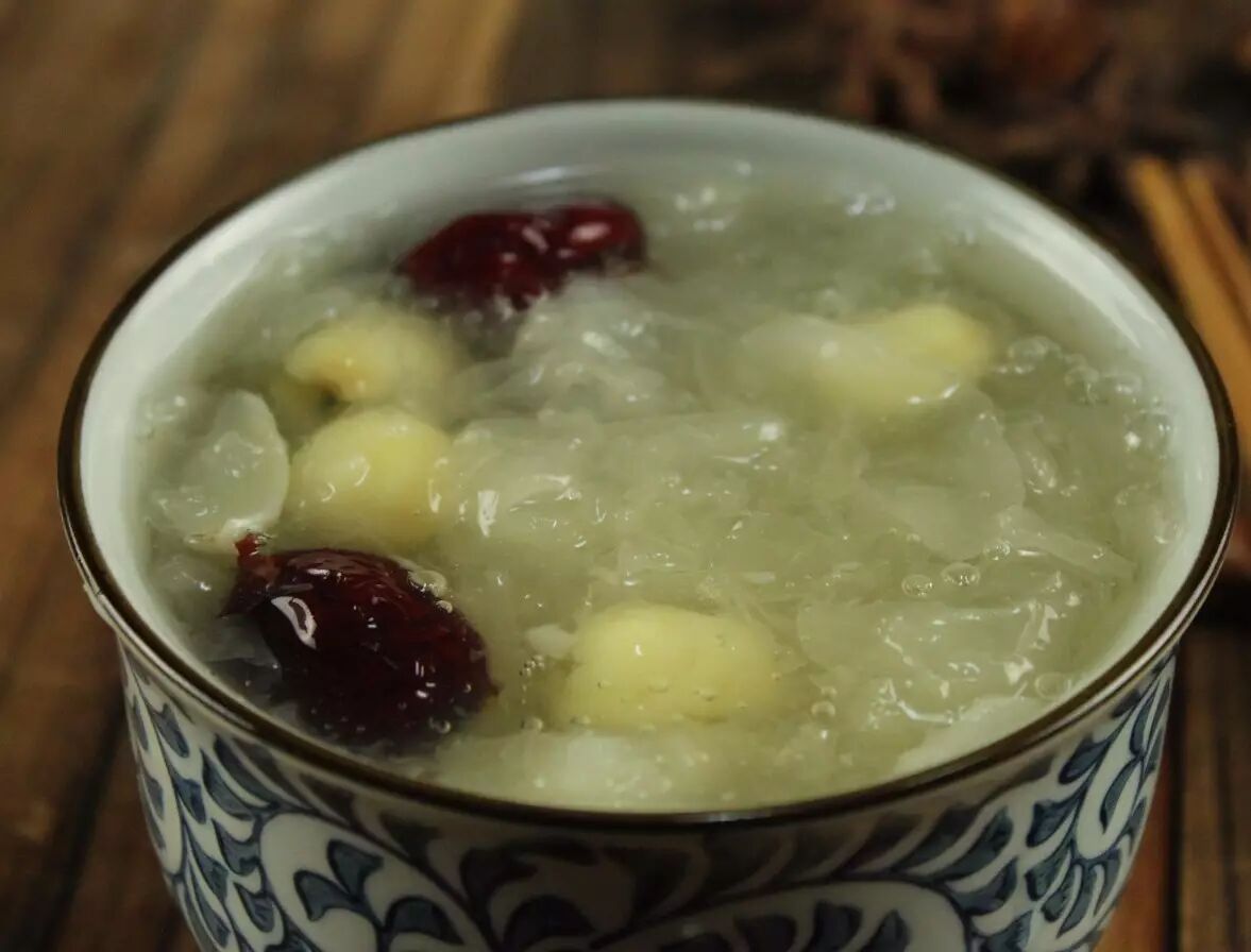 做法:先将雪耳泡发,去掉雪耳的蒂根,撕成小朵,莲子、红枣浸泡30分钟。将所有材料放入砂锅中,先用中火把水烧开,然后转文火慢炖40分钟左右,再加入适量冰糖,20分钟后即可出锅。