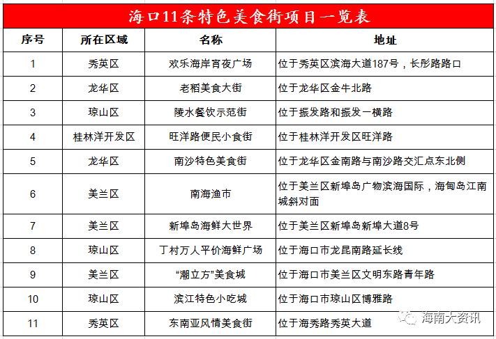 以上介绍的 秀英区欢乐海岸宵夜广场、龙华区老稻美食大街和丁村万人平价海鲜广场、美兰区“潮立方”美食城和新埠岛海鲜大世界等5处特色美食街完成建设任务并已正式运营。
