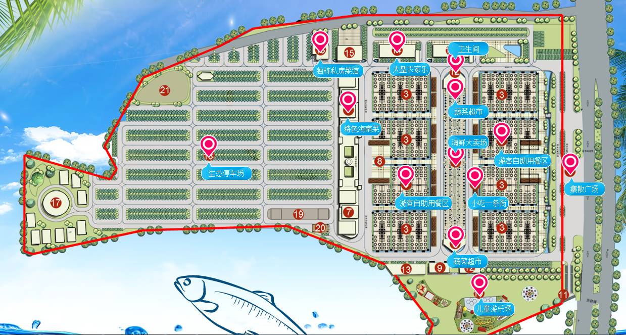 概况:海口丁村万人海鲜广场位于海口市龙昆南路延长线,项目按4A级景区标准规划建设,总占地面积160亩,总投资1.3亿元。