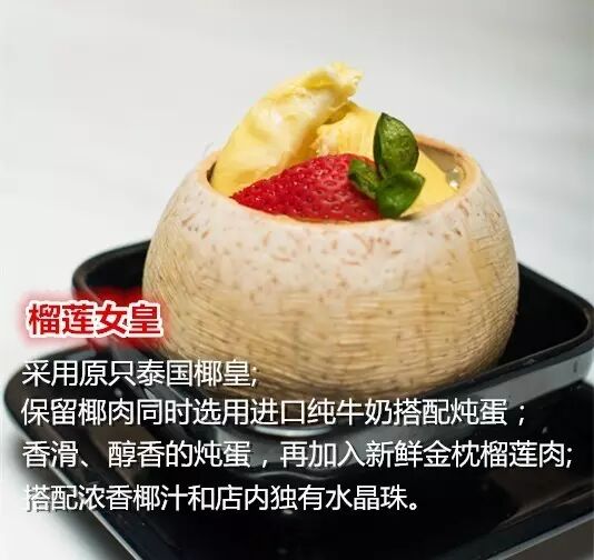在感受气氛的同时,声色妹并无忘记重要的环节:“吃吃吃”!随即就点了一个名字非常适合我的甜品——冰糖椰王系列●榴莲女皇(你没理,我霸气)↓↓↓