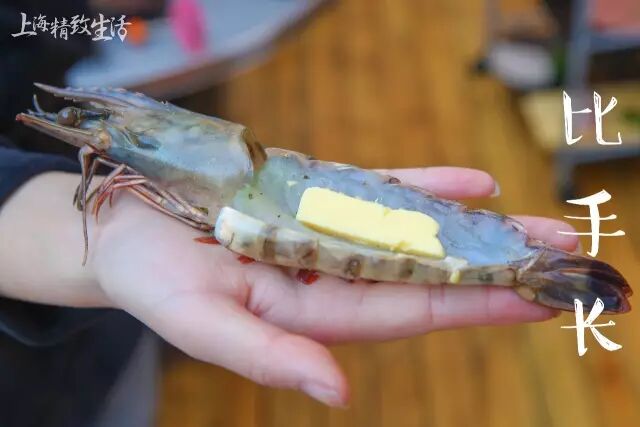 小黄瓜也自认手不算短了,没想到这里的大明虾竟然比小黄瓜的手还长!看它通透的样子就能知道有多新鲜了。