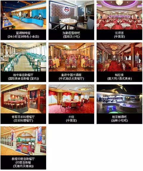 邮轮上的餐厅保证能提供最顶尖的美食来满足不同游客的要求。您不妨到侍军日本料理品尝高级的日本料理,或到泰姬印度自助餐厅享受印度的风味美食!