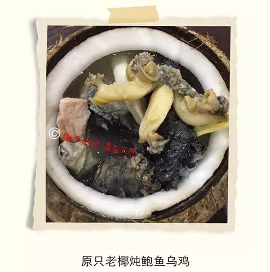 原只海南老椰作为炖盅,老椰肉的清香通过清炖,慢慢融入到鲍鱼和乌鸡汤里面,汤汁充满老椰的清新香味,感觉就好似由里润到外一样..