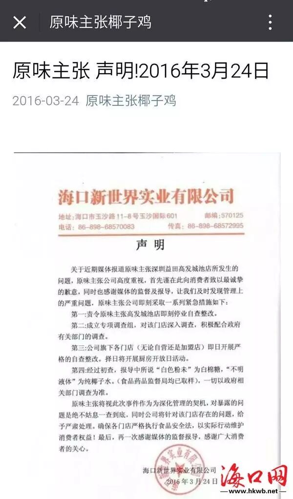 海南原味主张餐饮有限公司微信公众平台“原味主张椰子鸡”公开发表声明。