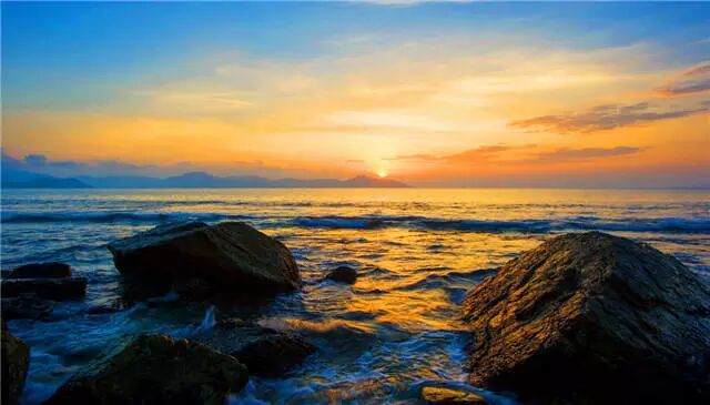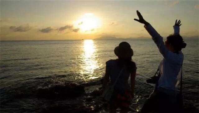 日落之前在海边观夕阳,听海浪的声音;看天空落日和大海成一线的醉人美景,感受大自然的神奇瑰丽。