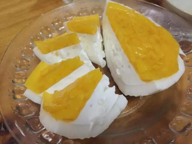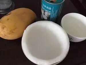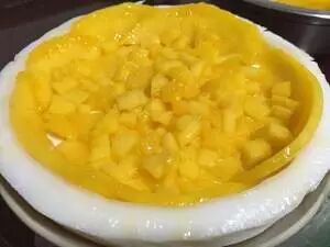 取出椰子,椰浆层凝固后再铺上芒果丁,然后用温水溶化吉利丁粉和白砂糖(按个人口味),晾凉后倒入芒果层,再放冰箱冷藏一小时以上