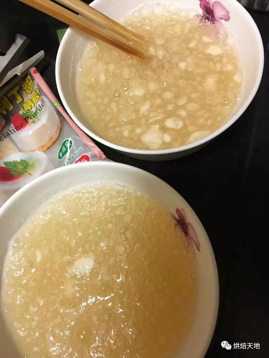 2. 将吉利丁粉均分在两个碗中