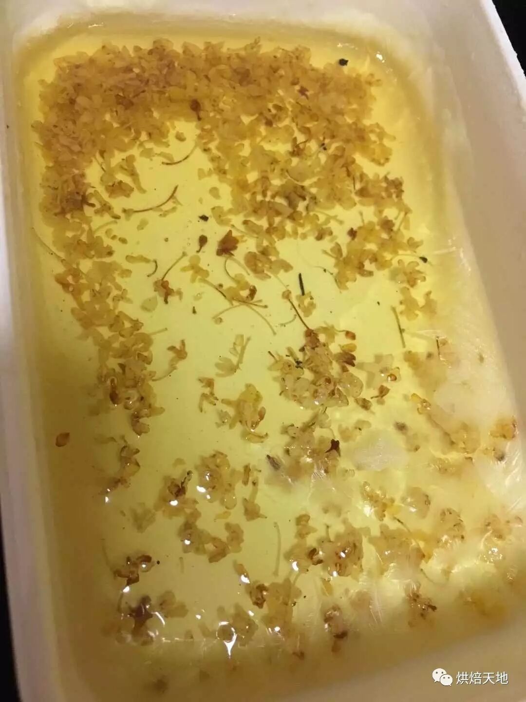 6. 先将桂花水倒入容器中,放入冰箱冷冻室约20分钟后取出,再倒入椰浆水,放入冰箱冷冻室。反复(取决于你要做几层的)