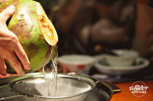 椰妹椰子鸡的标配就是“三颗椰子一只鸡”,开始先是倒入两颗椰子,后面等到需要加汤的时候,再加一颗。妥妥的真材实料喔。