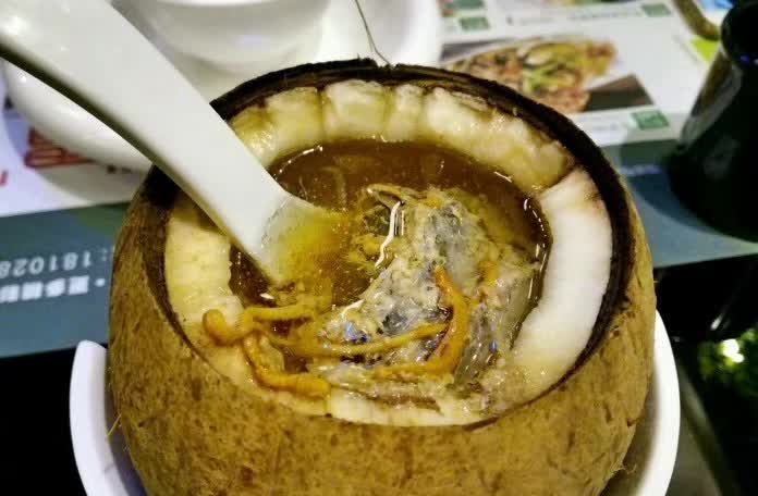 这里的招牌椰子鸡,汁清如水,甜似蜜,晶莹剔透,清凉解渴,再加上它配以多种滋补药材熬制而成,益气生津。