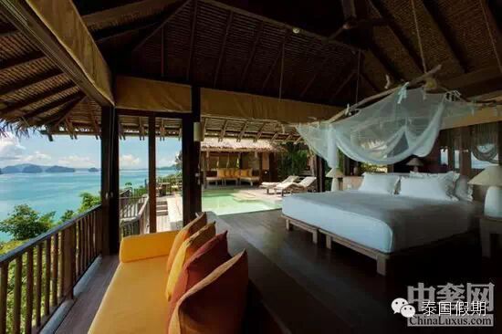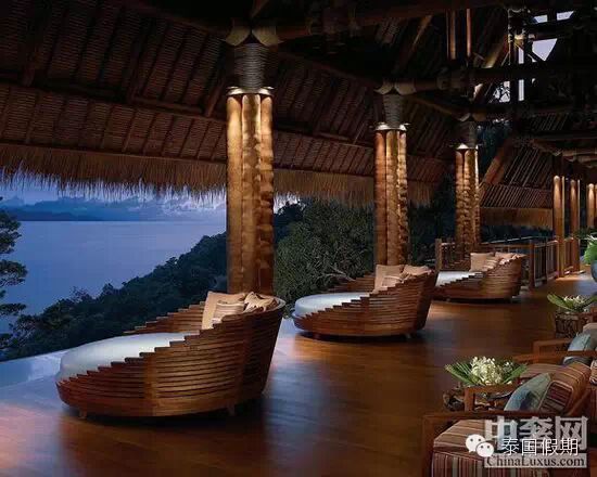 被私人管家引领进两层的别墅里。从外貌看来,建筑充满了原始风貌,建材都是来自大自然的棕榈木,上面不漆油漆,门抽都是麻绳做的,免费矿泉水都用玻璃瓶盛载。度假村注重环保,而且是“有智慧的奢华”,乍看是质朴无华不见修饰,但细细端详各小物小节处,便会发现,顶级度假村所当有的细腻与独特的韵致一样不缺,全隐隐然藏在骨子里的细节里。