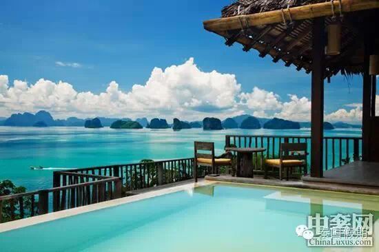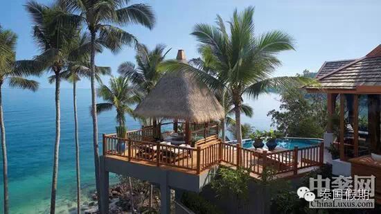 车往小院方向开,经过平平无奇的木门进入小小的院落。一扇窄窄的小门虚掩着,有个安静的姑娘拿起门旁的鼓锤,用一声鸣锣迎接你的到来。这个时候,小门打开,你被引进小门check-in。两秒钟之后,全世界各种各样的语言发出的惊叹声会从90%以上的客人的嘴里发出。剩下10%的安静客人,只是被眼前美景慑住,忘记惊叹因为猝不及防地,270度泰国湾碧蓝的海景如同IMAX的巨大屏幕,强行占满了我的视线。