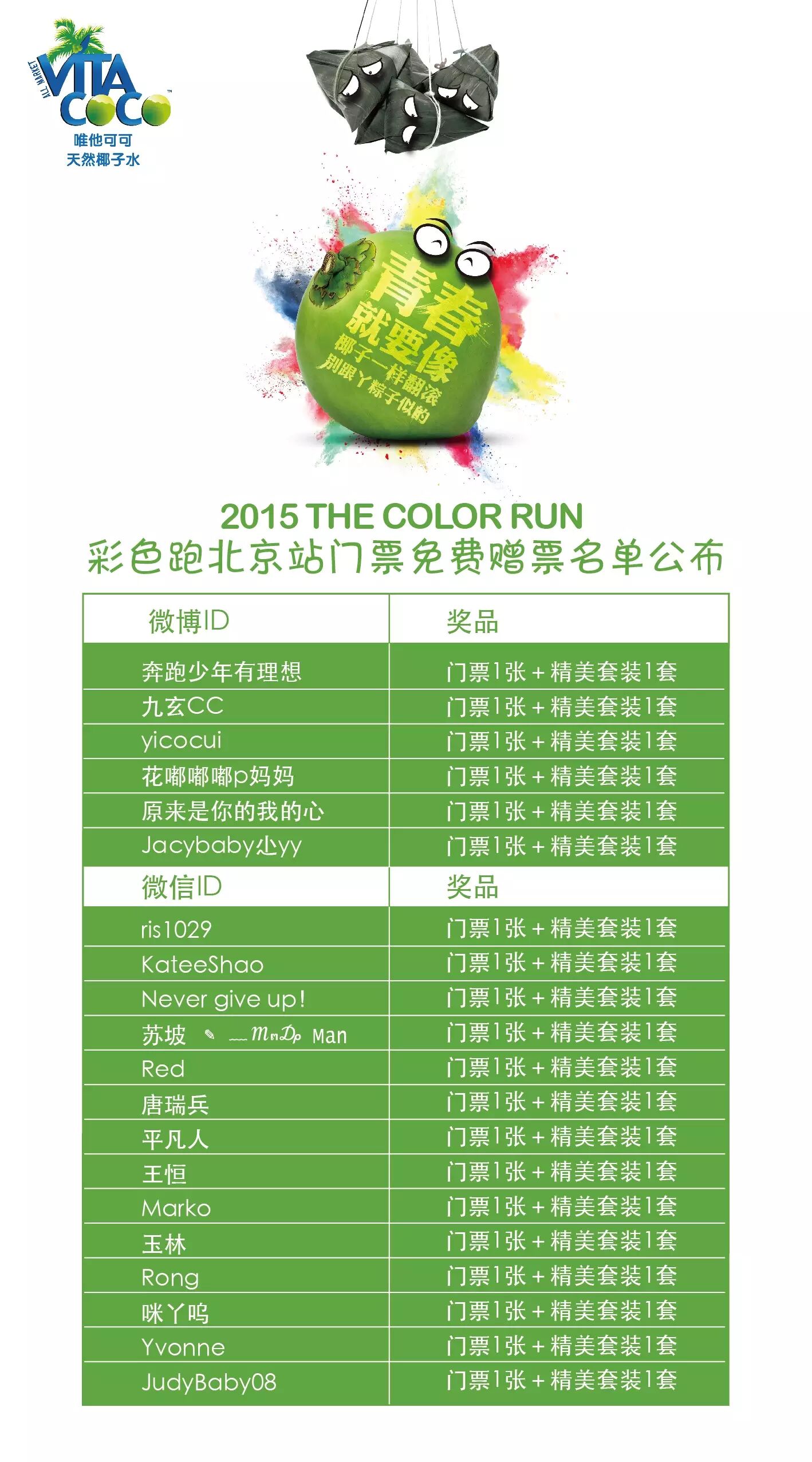 北京彩色跑中奖名单像椰子一样翻滚出炉啦,小伙伴们速来围观! 2023-04-19 23:50:29 2015 The Color Run北京站中奖名单公布啦!小伙伴们是否已经整装待发,坐等免费门票呢?啥都不用多说了,快来看看名单中是否有你呢? Duang Duang Duang ~~中奖的小伙伴是否像椰子一样欣喜的滚下床铺了呢?当然啦,没有中奖的小伙伴我们也不要气馁哦,密切关注Vita Coco官方微信,积极参与各类互动活动,赢取更多精彩好礼,下一个,说不定就是你哦!