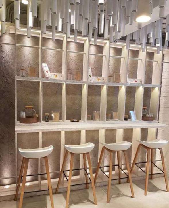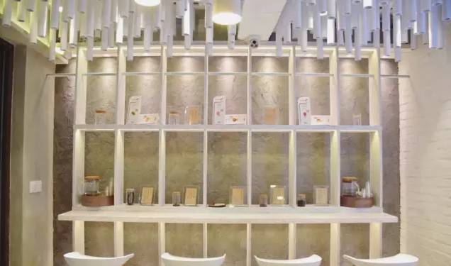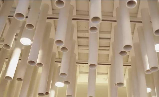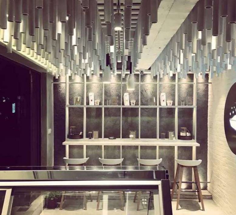 店内的整体风格简约又富设计感,店主用卷筒纸卷轴覆盖房顶象征冰柱,错落之间,犹如冰山一窟。