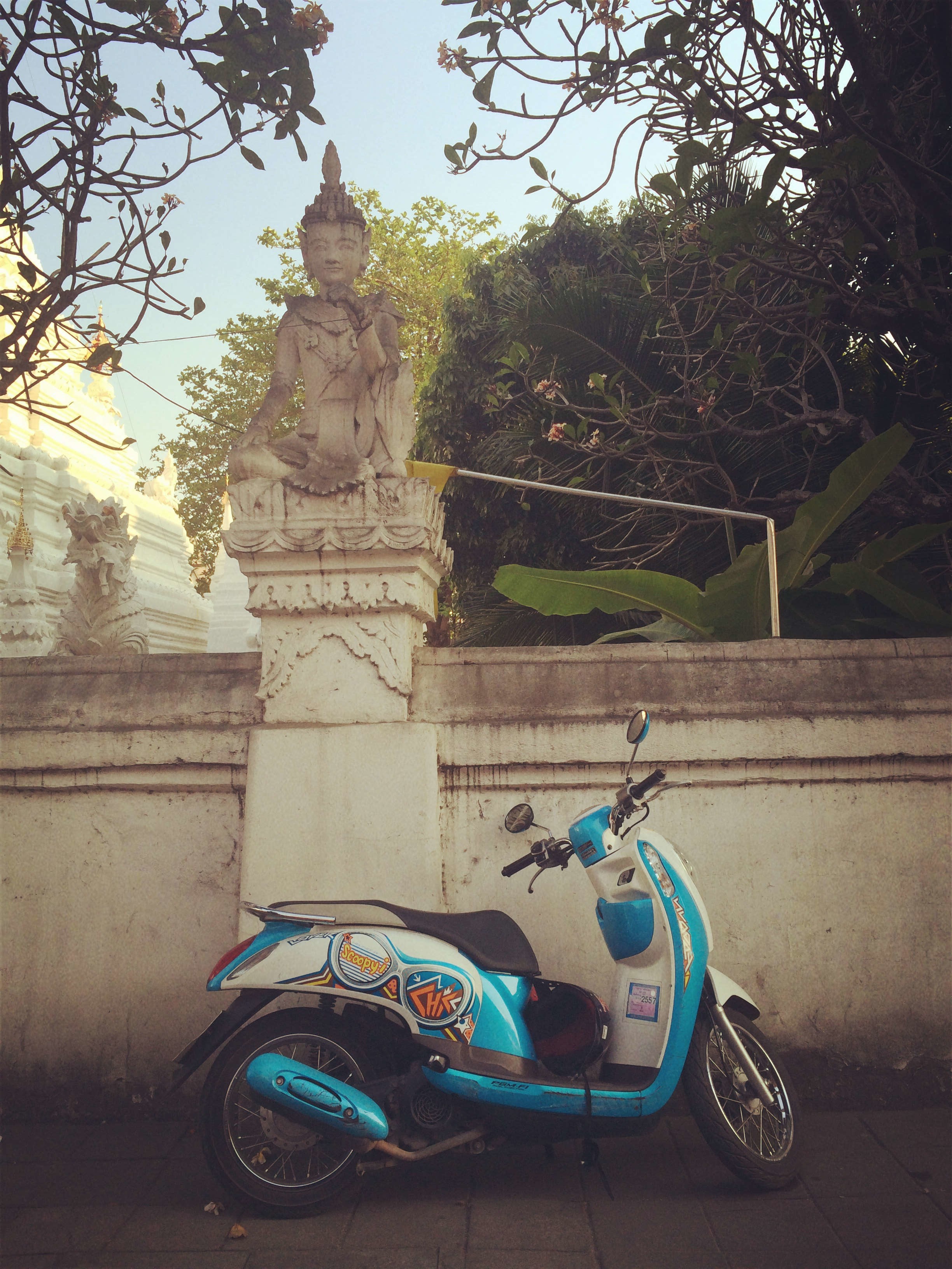 在清迈租车很方便,护照原件(你最好和店家协商只押护照的复印件)或交押金8000铢就可以租用一辆踏板摩托车了,时限24小时,租车的费用250铢(约不到50人民币)若是大型机车则价格会高一些。汽油自行到加油站加满,50铢100铢随你喜欢加,到了加油站不用担心不知道加几号油,里面的工作人员自然会指引你。