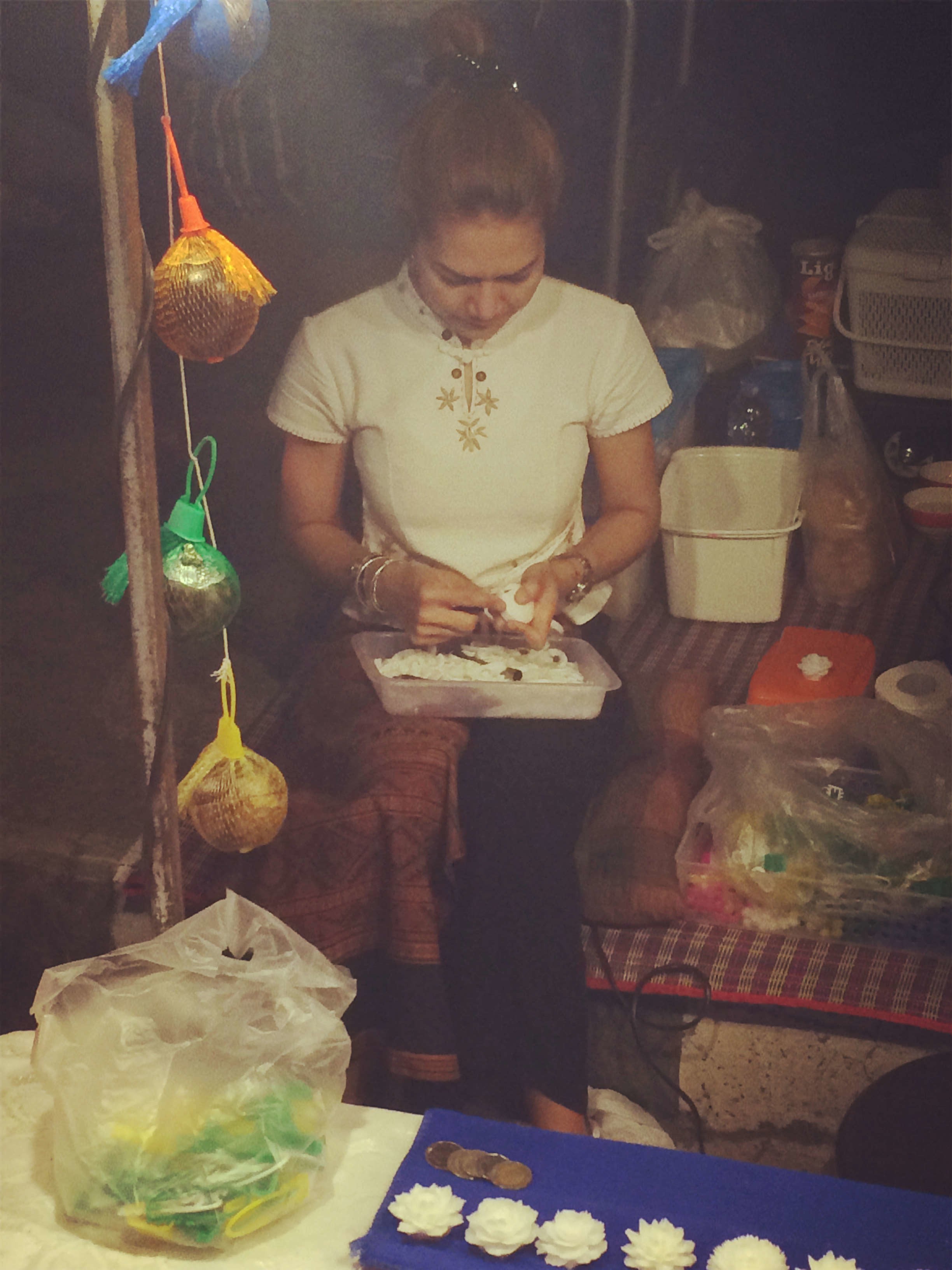 在清迈有一种手工艺品非常有名,就是雕花肥皂。它是由手工艺人用手中的小刻刀一刀一刀纯手工雕刻而成,再上色完成,具有非常高的欣赏价值。这是一位摊主正在雕刻她手中的肥皂。