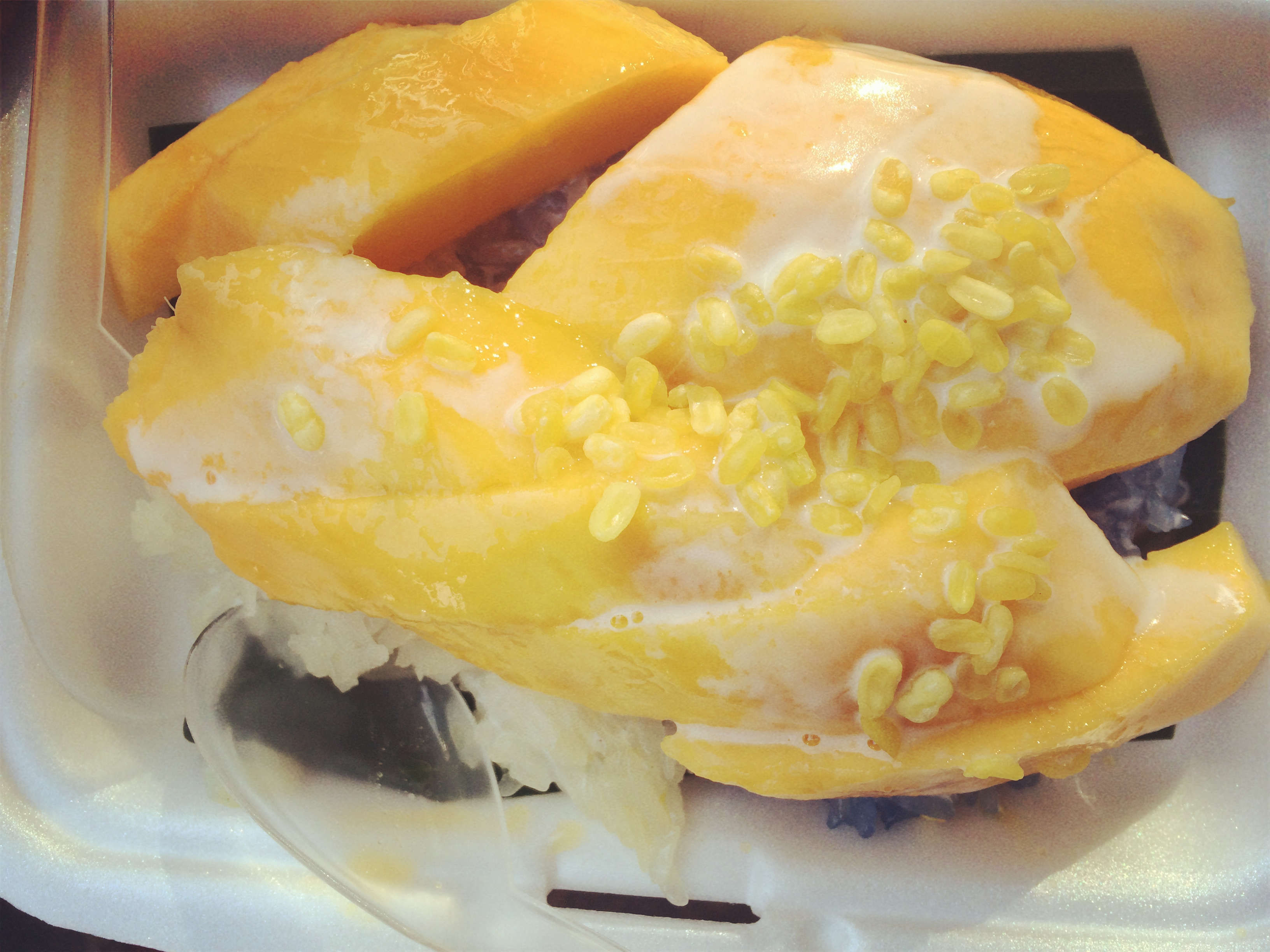泰国的芒果一年四季都有,而且非常新鲜淳甜。芒果糯米饭要好吃除了糯米要好外那就是要选优质的芒果了。金黄色的芒果口感最佳,而且一定要请店家现吃现削芒果,如果遇到那种削好皮摆放的都干瘪的芒果那就换一家吧。